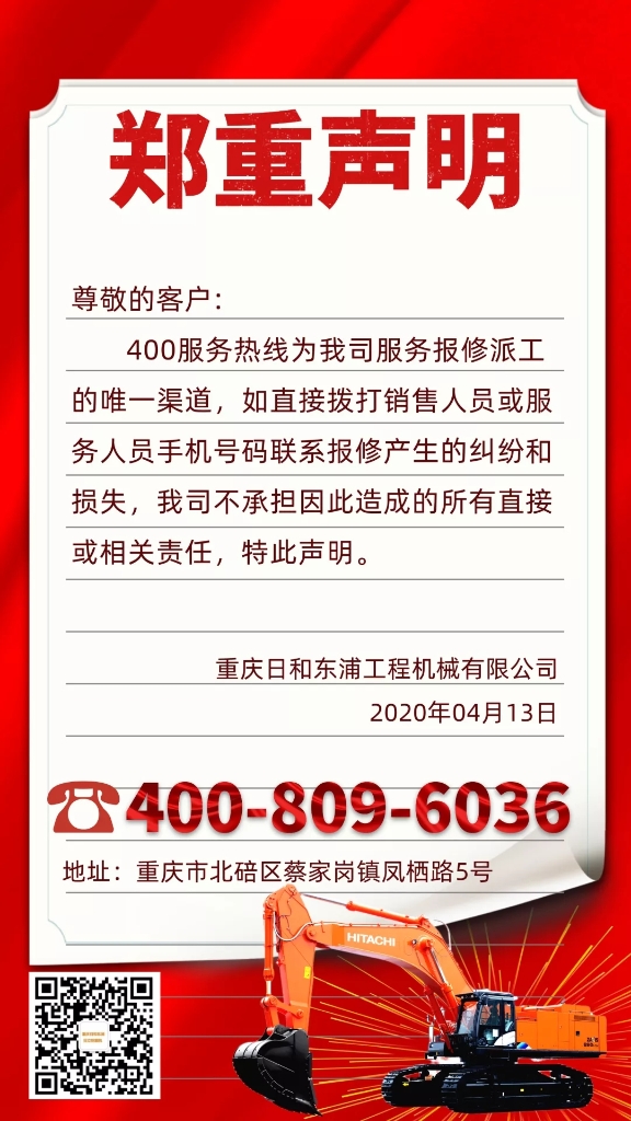 鄭重聲明:400服務(wù)熱線(xiàn)為我司服務(wù)報修唯一渠道 2020.04.14 返回列表 上一篇 2020.04.21 員工離職通知 下一篇 2020.04.03 【高能升級】日立建機“一臂之力”的秘密 熱門(mén)新聞 慶祝六一兒童節 2023-06-02 不是吧阿Sir? 7折耶! 2020-08-31 除了七夕和愛(ài)情還有日立ZX330-5A! 2020-08-26 @您,出大事啦! 2020-07-20 夏日炎炎,請接收這一份如影隨行的清涼! 2020-07-13 離職公告 2020-06-24 終于等到你,為你虧本也樂(lè )意! 2020-06-17 “夏不為利,后惠無(wú)期” 2020-06-17
